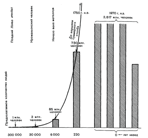 Рис. 82. Рост населения в мире за 300 000 лет. Четыре столбика справа должны быть составлены вместе так, чтобы сформировать единый высокий столбик; полученный высокий столбик будет пропорционален остальным. В 1970 г. в мире было в пять раз больше людей, чем в 1750 г.