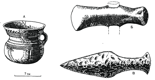 Рис. 83. Изделия эпохи неолита из Западной Европы, А. Керамический кувшин с ручкой (Швейцария). Б. Шлифованный топор, изготовленный из куска вулканической породы. Отверстие сделано для деревянной рукоятки (обозначенной пунктирными линиями) (Австрия). В. Кремневый кинжал с лезвием и удобной рукояткой (Скандинавия),