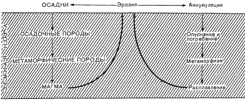 Рис. 7. Упрощенная схема круговорота пород как непрерывно действующей системы. Справа – последовательность событий, следующих одно за другим в направлении, показанном стрелками. Слева – последовательность соответствующих изменений, которым подвергается материал горных пород. Они также следуют одно за другим.