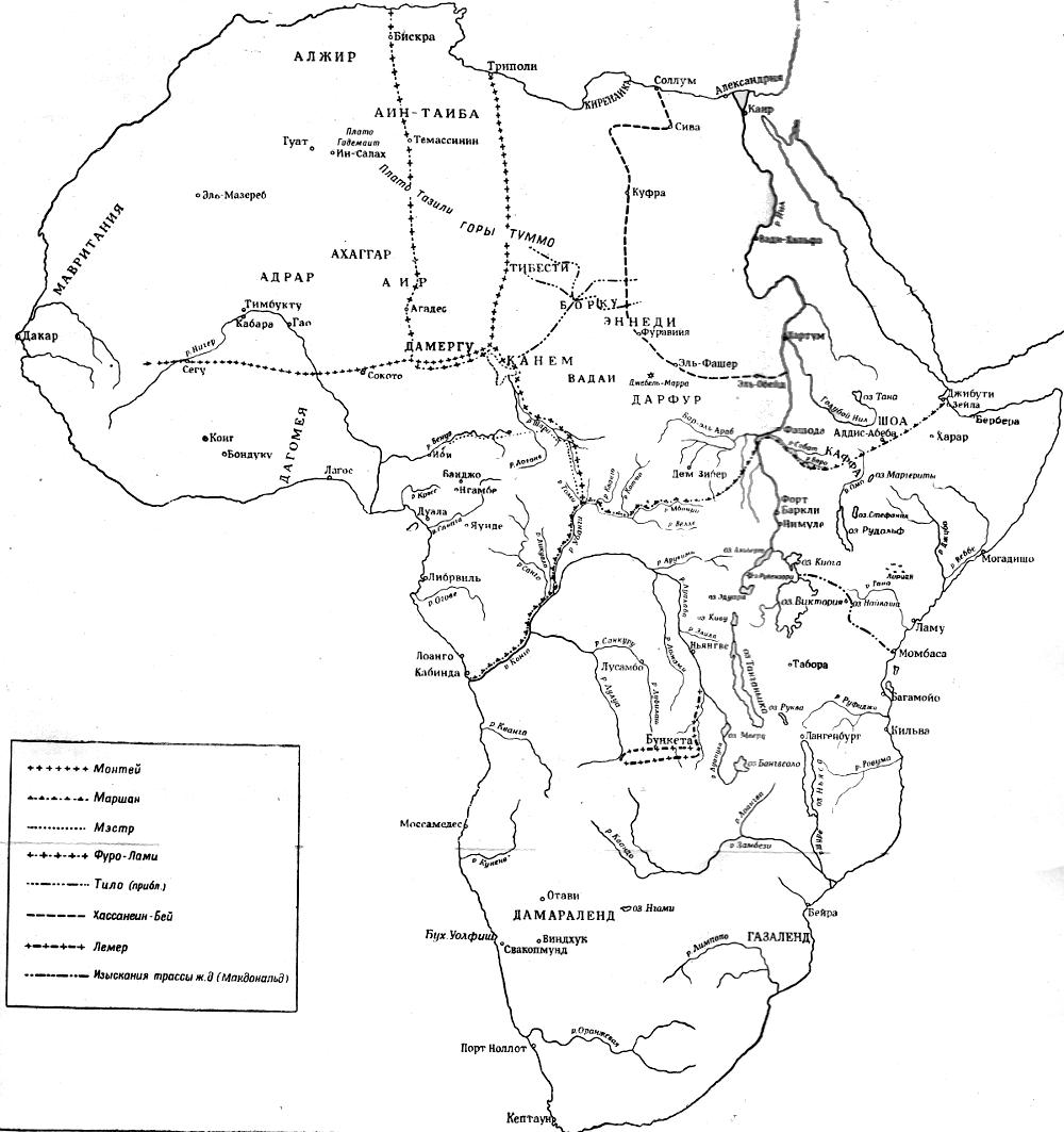 За рассматриваемый период в области исследования этой части Африки была проделана значительная работа. Большая часть ее была связана с политикой европейских держав, в особенности англичан в Ньясаленде, немцев, в Танганьике и французов в их экваториальных владениях. В итоге очень многие исследовательские предприятия не ставили себе никакой крупной научно-географической проблемы. Исследование Центральной Африки мы предполагаем рассмотреть в следующем порядке: сначала — исследования неизвестной области к западу от озера Танганьики, далее — исследования, наиболее тесно связанные с бассейном Конго и, наконец,— связанные с Западной Африкой в междуречье Конго, Нигера и Нила. После этого мы перейдем к Восточной Африке, причем, как и при рассмотрении противоположного побережья, мы будем итти с юга на север. Такой план далеко не совершенен, и кое-где мы от него отклоняемся, но, придерживаясь его, можно дать связный обзор множества мелких, но важных исследований.