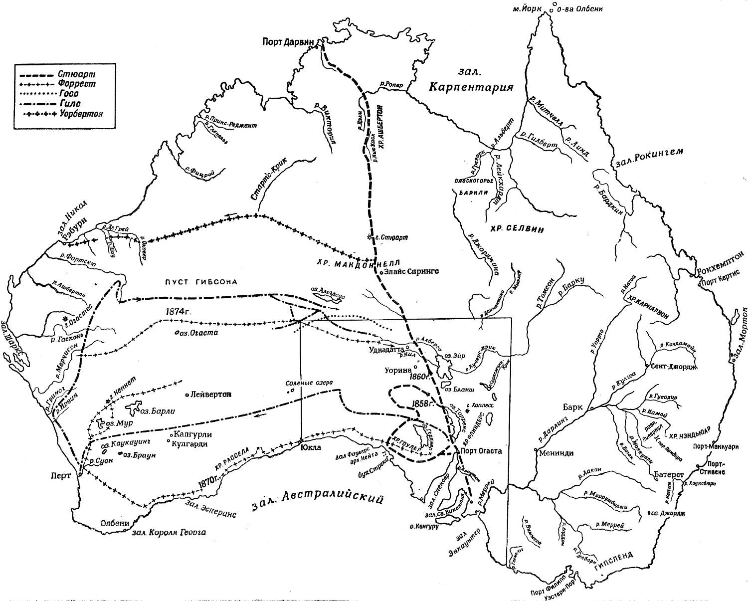 К северу от Перта Ф. Грегори открыл в 1846 г. озеро Мур, брат же его, А. Грегори, выступил в путешествие с целью достичь реки Гасконь и исследовать хинтерланд залива Шаркс. Он выступил в северо-западном направлении, прошел около 1500 миль и достиг 27° ю.ш., но не разрешил поставленной себе главной задачи.