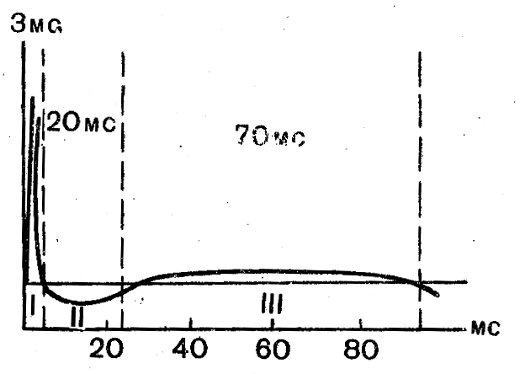 Рис. 6. Изменение порога возбуждения нервных волокон при одиночном импульсе: I — абсолютная и относительная рефрактерная фаза (3 мс); II — супернормальная фаза (20 мс); III — субнормальная фаза (70 см)