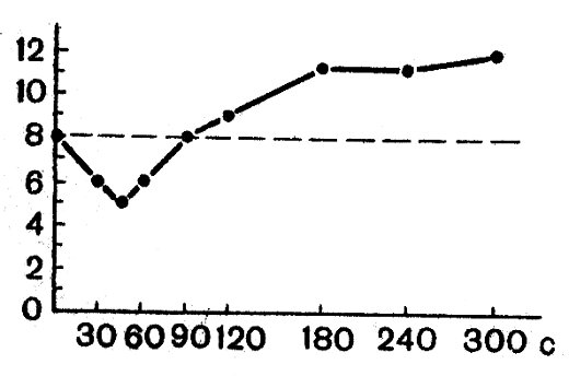 Колебательный характер носят изменения также субстанциональных показателей. В литературе имеются многочисленные данные о двухфазном изменении прозрачности и светорассеяния цитоплазмы. По мере увеличения дозы воздействия вначале имеет место повышение, а затем снижение прозрачности или соответственно уменьшение и увеличение светорассеяния цитоплазмы. Аналогичная картина двухфазного изменения наблюдается и в отношении вязкости — после некоторого разжижения наступает загустевание цитоплазмы. Один из таких примеров приведен на рисунке 9. В течение первых 90 с после облучения вязкость цитоплазмы амеб уменьшается, а затем повышается.