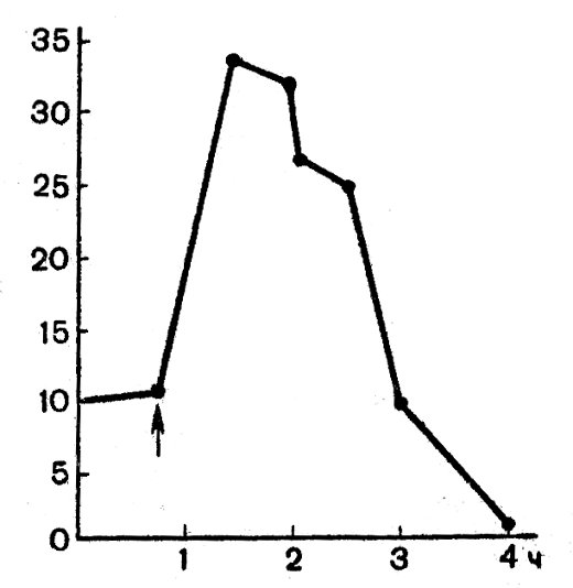 Рис. 12. Изменение дыхания печени под действием хинина По оси абсцисс — время, в часах; по оси ординат — потребление О2 (в мм3 на 1 мг сухой ткани). Стрелкой отмечено начало действия хинина (6x10 —4 м)