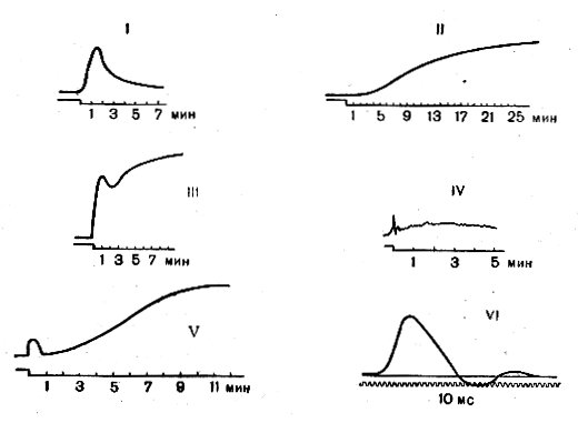 Даже на основании приведенных немногочисленных данных видно, что ответная реакция представляет собой колебательный процесс, который может протекать с очень разными скоростями (тысячные доли секунды, минуты, часы, сутки) в зависимости от вида и силы раздражителя. Помимо скорости реакции специфика в действии раздражителей проявляется и в разной степени выраженности колебаний. В качестве наглядного примера, иллюстрирующего сосуществование неспецифического и специфического в ответных реакциях, приводим ряд миограмм (рис. 13), полученных на портняжной мышце лягушки действием различных раздражителей: хлористого калия, этилового эфира, этилового спирта, соляной кислоты, изоамилового спирта, одиночного раздражения через нерв. Все эти воздействия вызывают мышечные сокращения, но развиваются во времени они по-разному, очень специфично для каждого агента.