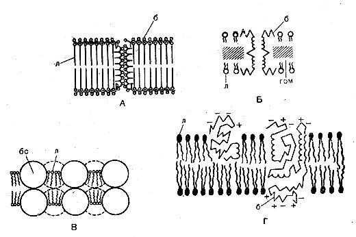 Рис. 14. Модели мембраны: А — по Даниели—Давсону—Робертсону; Б — по Ленарду и Зингеру; В — по Вандеркой и Грину, Г — по Зингеру и Николсону; б — белки, л— липиды; бс — белковые субъединицы; гомгидрофобная область мембраны
