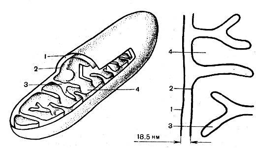 Рис. 16. Схема строения митохондрии. 1 — внешняя ограничивающая мембрана; 2 — внутренняя мембрана; 3 — кристы; 4 — матрикс