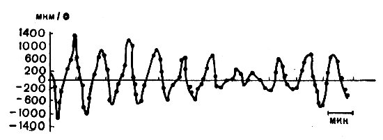 Рис. 39. Самопроизвольные изменения скорости движения цитоплазмы в тяжах плазмодия миксомицета (Камия, 1962)