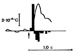 Рис. 67. Температурные изменения во время прохождения импульса по немиелинизированному нерву кролика (Howanth, 1968). Столбики вверх — выделение тепла: столбики вниз — поглощение тепла. Линия — ток действия