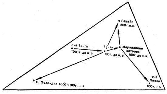 В 30-х годах нашего столетия Те Ранги Хироа разработал схему так называемого полинезийского треугольника, которая дает весьма наглядное представление об основных путях миграции и последовательности заселения островов Полинезии. Южный угол треугольника располагается в Новой Зеландии, северный — на Гавайях, восточный — у острова Пасхи.