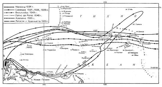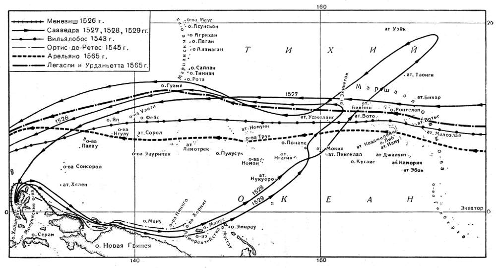 Неудачи, дважды постигшие Сааведру при его попытках пересечь в восточном направлении Тихий океан, легко объяснимы. И в 1528 и в 1529 гг. Сааведра, покинув остров Тидоре, шел сперва на восток вдоль северного берега Новой Гвинеи к островам Адмиралтейства, а затем поворачивал на северо-запад к восточным Каролинам и Маршалловым островам. На первом, новогвинейском отрезке пути в мае — июне и июле (а именно в это время года Сааведра предпринимал свои попытки пробиться к востоку) дуют юго-восточные муссоны, которые гонят на северо-запад довольно сильное течение. Не мудрено, что вдоль берегов Новой Гвинеи «Флорида» шла с черепашьей скоростью и часто ложилась в дрейф или отстаивалась на якоре в ожидании очень редких попутных ветров. Сааведра, вероятно, проклинал Менезиша, по следам которого намечен был маршрут плавания на восток вдоль берегов Новой Гвинеи. Возможно, однако, что португальцы, которым знаком был режим муссонов Индийского океана, сознательно ввели в заблуждение Сааведру, посоветовав ему в мае плыть вдоль берегов «Страны Папуа» на восток в сезон юго-восточных противных муссонов.