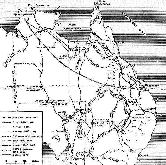Берк и Стюарт опрокинули барьеры, воздвигнутые природой вокруг центральноавстралийской пустыни. Если прежде подавляющее большинство путешественников ограничивалось исследованиями по периферии центральной Австралии, то после Стюарта многие его последователи стали пересекать внутренние области материка. Обычно пересечения эти совершались в широтном направлении. Меридиональный маршрут Стюарта в начале 70-х годов XIX в. стал трассой трансавстралийской телеграфной линии, а промежуточные станции, расположенные на этой линии,— исходными базами для экспедиций в глубь материка. Эта линия, сданная в эксплуатацию в 1872 г., от Порт-Огасты, гавани, лежащей в глубине южноавстралийского залива Спенсер, вела к западному берегу озера Эйр и затем примерно вдоль 134-го меридиана пересекла центральную Австралию; на севере ее конечным пунктом был Дарвин.