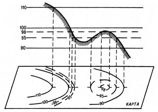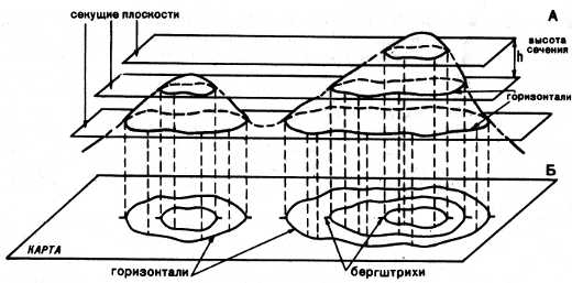 Секущие плоскости строят через равные промежутки по высоте, и полученные линии сечения проектируют отвесными лучами на общую плоскость (карту). Так на карте получают изображение рельефа системой горизонталей в виде замкнутых кривых линий (рис. 30, Б). Очертания горизонталей, очевидно, обусловлены внешним обликом форм рельефа, а их количество на данной карте — наибольшей разностью высот на картографируемой территории.