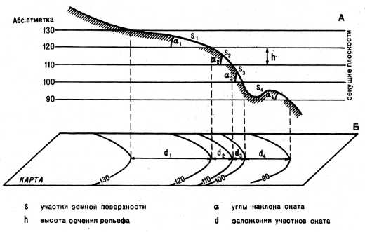 Разность высот двух соседних основных горизонталей называется высотой сечения рельефа. На рисунке 31, А показан разрез участка земной поверхности вертикальной плоскостью. Секущие горизонтальные поверхности проведены через 10 м по высоте и имеют отметки 90, 100, 110, 120 и 130 м. Высота сечения h равна 10 м. Линии сечения земной поверхности горизонтальными плоскостями затем спроектированы на общую горизонтальную поверхность (рис. 31, Б), т.е. карту. Промежутки на карте между двумя соседними горизонталями называются заложением d. Заложение всегда меньше, чем расстояние S между теми же точками на склоне (скате).