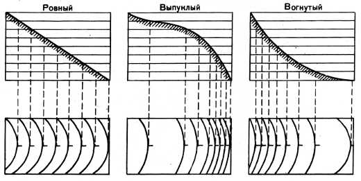Основные элементы и формы рельефа. Рельеф земной поверхности слагается скатами (склонами) различной формы и крутизны; схематически выделяют склоны прямые и изогнутые в плане, а также склоны прямые (ровные) и изогнутые в профиле. Их изображения на карте отличаются формой горизонталей и характером чередования заложений разной величины (рис. 33).