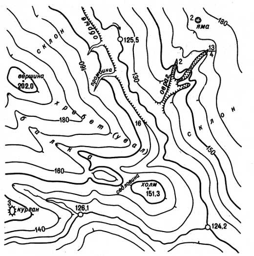 На топографических картах рельеф изображают с помощью горизонталей, которые дополняются указанием высот характерных точек местности и условными знаками отдельных элементов и форм рельефа.
