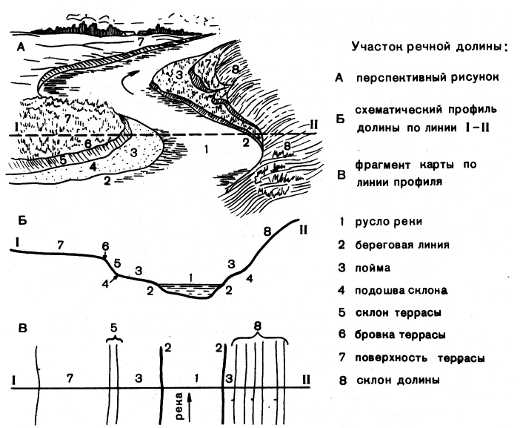 На рисунке 35 представлено перспективное изображение участка речной долины с обозначением ее частей, поперечный разрез долины, а ниже — схематическое изображение горизонталями полосы речной долины вдоль линии профиля. Редкие горизонтали на поверхности террасы сменяются сгущением горизонталей на участке 6—5—4. Склон и горизонтальная площадка, например пойма, образуют перегиб склона (участок 5—4—3); в этом случае после сгущения горизонталей следует их заметное разрежение.