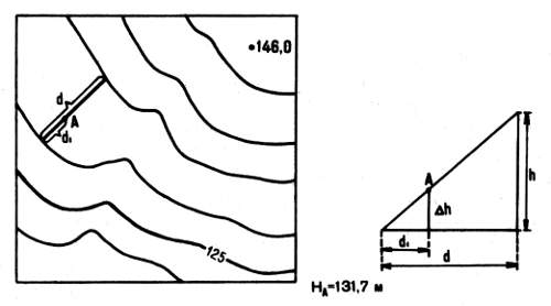 Абсолютная высота точки, лежащей на горизонтали, равна высоте этой горизонтали. Абсолютную высоту точек, расположенных между горизонталями, получают интерполяцией высот соседних горизонталей. На рисунке 36 h — высота сечения рельефа, Hниж. — отметка ближайшей к точке нижней горизонтали, d — заложение ската на карте между двумя соседними горизонталями, где лежит точка А с искомой высотой, d1 — расстояние от точки А до нижней горизонтали, НА— отметка точки А.