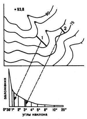 Рис. 37. Определение крутизны скатов на заданных участках путем переноса заложений с карты на график заложений α1 = 1°20'; α2 = 3°10'