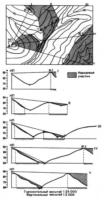 С помощью построения профилей определяют поля невидимости, т.е. закрытые участки местности, непросматриваемые с пунктов наблюдения. На карте из точки наблюдения по направлению возможных препятствий проводят прямые линии и строят по ним соответствующие профили.