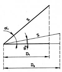 При измерении линий, расположенных на наклонной поверхности, следует учитывать, что ее горизонтальная проекция, изображаемая на карте, всегда короче измеренной величины. Как видно на рисунке 56, горизонтальная проекция линии местности D = Scosα, где S — измеренная длина, α — угол наклона; отсюда поправка за наклон ΔS = S — D или ΔS = S — S cosα=S(l — cos α), откуда