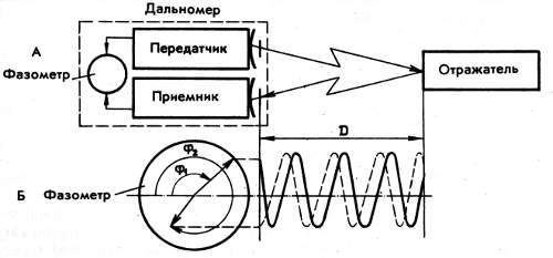 Рис. 59. Принципиальная схема фазового дальномера (А). Поступление колебаний на фазометр (Б): сплошные линии — колебания, излучаемые передатчиком; пунктирные — колебания, прошедшие путь дважды — от передатчика к отражателю и от него — к приемнику. Разность фаз обоих колебаний измеряется фазометром. Расстояние D определяется целым числом волн и частью волны, измеренной фазометром