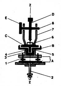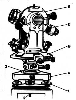 К кожуху алидады крепятся подставки 7, поддерживающие ось вращения 8 зрительной трубы D и вертикального круга Е.