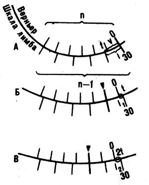 Наконец, на нижнем рисунке (В) ноль верньера сместился на дугу, равную 2t, и при этом второй штрих верньера совпал с каким-то штрихом лимба. Отсюда следует, что для оценки величины дуги некоторой части одного деления лимба а надо найти номер штриха верньера n1, совпадающего с каким-то штрихом лимба, и умножить на точность верньера t, т.е. a = n1t.