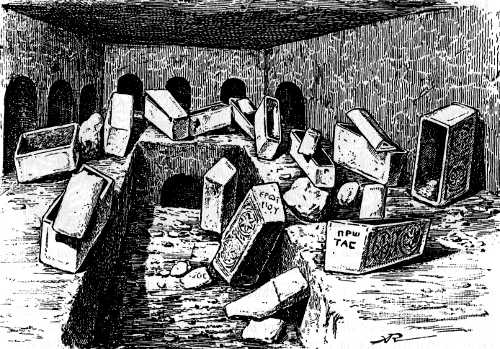 Оссуарии в заброшенной гробнице. Гравюра 1900-х гг. (Leclerq, 1907)