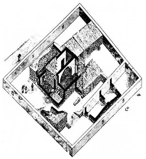 Неясно, можно ли говорить об этом сооружении IV в. как о церкви. В Дура-Европос (см. гл. П-2) «дом собраний» включил баптистерий, алтарь и другие необходимые литургические элементы; в ранней церкви в Кирк-Биццих (Сирия, ок. 300-330) с востока выделена алтарная часть и устроен «сирийский амвон» (Davies, 1968, 8). Следовательно, когда частный дом передавали общине под церковь, он получал архитектурно выраженные признаки богослужебного назначения. В Капернауме — не так. Если это и церковь, то необычная, без выраженной апсиды и других элементов, которые можно использовать для проповеди, крещения или службы. Как зала собраний главная комната маловата, а для жилой — велика. По-видимому, она служила своеобразной «посещаемой реликвией». Значительная часть участка внутри ограды оставлена пустой, возможно, для размещения паломников, их верховых и вьючных животных: многочисленность греческих граффити доказывает, что в «доме» часто бывали пилигримы.
