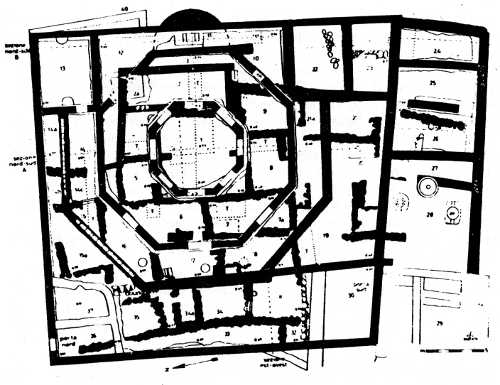 Начнем с «октагона», поскольку и дата, и функция его определяются надежно. Это церковь, под мозаичным полом которой найдено много монет первых двух десятилетий V в. и отвечающая им керамика с вероятной датой второй половины V — нач. VI в. Внутренний (центральный) октагон обрамлял «почитаемую комнату», мозаичный пол которой украшало изображение павлина и орнамент в виде цветов лотоса. Ко второй стене октагона была пристроена с востока апсида с маленьким баптистерием. Октагональные церкви в раннехристианской архитектуре довольно многочисленны (по крайней мере с 326 г., когда в Антиохии построили «Золотую церковь»), однако из них только две концентрические — на горе Гаризим и в Капернауме.53