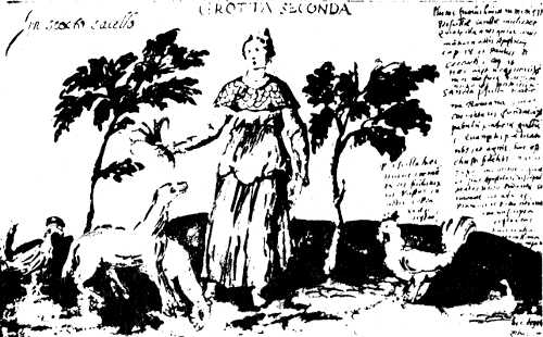 Копия катакомбной росписи, сделанная на рубеже XVI—XVII вв. для Альфонсо Чакона. Художник не понял сюжета, и представил Доброго Пастыря как «св. Присциллу, кормящую животных» (Stevenson, 1978)