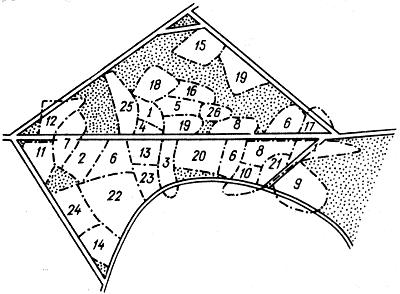 Рис. 2.15. Карта индивидуальных участков в популяции пеночки-веснички Phylloscopus trachilus (по D. May, 1949): цифрами обозначены индивидуальные участки