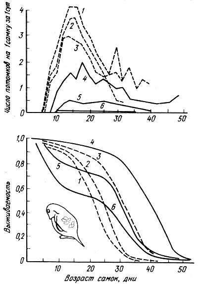Рис 2.16. Плодовитость и выживаемость самок Daphnia pulex при различных плотностях популяции (по Р. Риклефсу, 1979): число дафний в 1 мл: 1 — одна, 2 — две, 3 — четыре. 4 — восемь, 5 — 16, 6 — 32