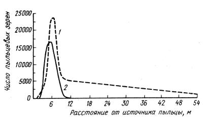 Кривые распределения пыльцы от родительских растений до мест падения часто обнаруживают эксцесс и асимметрию (рис. 2.17). Из данного рисунка следует, что большая часть сосновой пыльцы пролетает на ветру от 3 до 10 м, а дальше количество оседающей пыльцы быстро уменьшается. У крымской сосны в горных условиях зона свободного переопыления составляет 300—400 м по вертикали. У переопыляемого пчелами хлопчатника пыльца переносится в основном в радиусе 25 м. У люцерны, переопыляемой разными перепончатокрылыми, дальность разноса основной массы пыльцы составила 50 м, но некоторую ее часть находили на расстоянии километра и даже полутора километров.