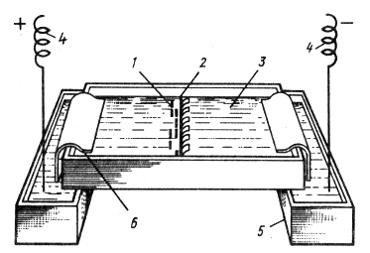 Рис. 3.1. Схема прибора для проведения гель-электрофореза (по Ф.X. Айале, 1981): 1 — окрашенные полосы, соответствующие разным фракциям ферментов, 2 — лунки для проб, 3 — гель, 4 — электрод, 5 — сосуд для буфера, 6 — контактный фитиль