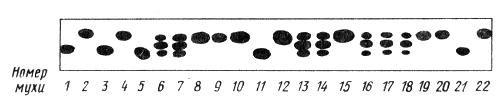 Рис. 3.2. Электрофореграмма аллозимов димерного белка малатдегидрогеназы у гомозиготных (FF или SS) и гетерозиготных (FS) особей Drosophila equinaxialis (по Ф.X. Айале, 1981): номера мух, гомозиготных FF— 2, 4, 8—10, 12, 15, 19, 20, 22; гомозиготных SS— 1, 3, 5, 11, 21; гетерозиготных FS — 6, 7, 13, 14, 16—18