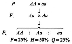 Пусть речь идет о наследовании различий в окраске цветков у ночной красавицы Mirabilis jalapa. Родительские формы обладают красной окраской (АА) и белой окраской (аа) цветков. Все дочернее потомство в F1, в соответствии с первым законом Менделя единообразно и характеризуется розовыми цветками, поскольку в данном случае имеет место неполное доминирование и промежуточное в сравнении с родителями выражение признака. Гибридные растения F1 дают женские и мужские гаметы двух типов: половина из них несет аллель А, тогда как другая половина — аллель а. При случайном комбинировании гамет в потомстве F2 будет иметь место расщепление на три фенотипических и соответственно генотипических класса — доминантных гомозигот, гетерозигот и рецессивных гомозигот. Ожидаемые частоты этих классов (обозначим их прописными латинскими буквами P, H, и Q) — 25, 50 и 25%. Таким образом, фенотипические и генотипические частоты в рассматриваемой ситуации (моногенные различия, неполное доминирование) есть доли особей трех указанных классов, выраженные в процентах или в долях единицы.