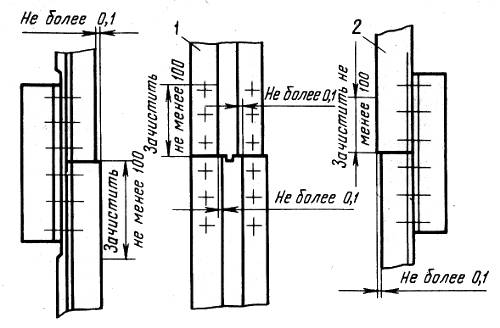 Рис. 2.7. Боковое смещение головок направляющих в местах стыка: 1 — направляющие кабины; 2 — направляющие противовеса