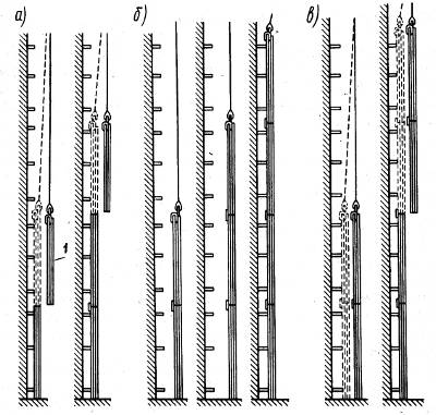 Монтируют направляющие с помощью монтажной лебедки, устанавливаемой на плиту перекрытия, методом наращивания, методом подращивания и комбинированным методом (рис. 2.8). При методе наращивания (рис. 2.8, а) сначала устанавливают нижние отрезки направляющих, а на них — последовательно одна на другую вышележащие отрезки. При методе подращивания (рис. 2.8, б) к тросу монтажной лебедки подвешивают верхний отрезок направляющих, приподнимают ее на высоту, необходимую для присоединения нижележащего отрезка, и так до тех пор, пока не будет собрана вся нитка направляющих. После этого направляющие подводят к деталям крепления и закрепляют. Комбинированный метод (рис. 2.8, в) применяют при большой высоте подъема.