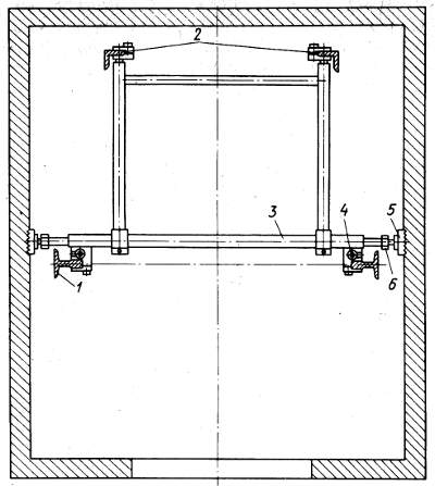 Рис. 2.9. Кондуктор для выверки направляющих: 1 — направляющие кабины; 2 — направляющие противовеса; 3 — кондуктор; 4 — отвес; 5 — упорная плита кондуктора; 6 — распорный болт