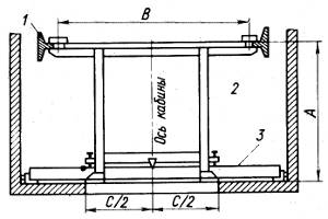 Рис. 2.11. Кондуктор для выверки портала и порога: 1 — направляющая кабины; 2 — шаблоны; 3 — порог шахтной двери; А — проектное расстояние от оси направляющих кабины; В — штихмас направляющих кабины; С — ширина дверного проема
