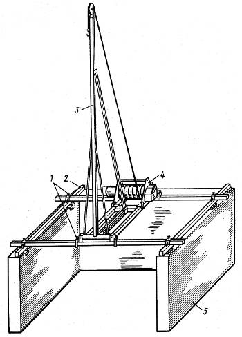 Рис. 2.12. Установка приспособления для монтажа дверей шахты пассажирских лифтов: 1 — фиксатор; 2 — рама раздвижная; 3 — мачта; 4 — лебедка; 5 — стены шахты лифта