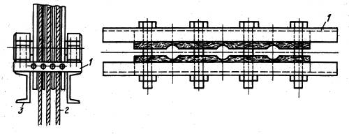 Рис. 2.17. Приспособления для удержания канатов: 1 — приспособление; 2 — ветви канатов, идущие к канатоведущему шкиву; 3 — балка блочного помещения