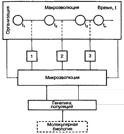 В заключение этого раздела целесообразно привести схему, отображающую структуру эволюционной теории по представлениям СТЭ, заимствованную из уже упоминавшейся работы В.Г. Борзенкова (1987). На схеме (рис. 2) фундамент всей теории составляет генетика популяций как единый причинный механизм эволюции. Трансформация генетической структуры популяции завершается видообразованием – центральным событием микроэволюции, очерчивающим ее верхнюю границу. Для объяснения макроэволюции в терминах микроэволюции требуется определенное число дополнительных теоретических гипотез и моделей, изображенных прямоугольниками 1–3. На схему попала и молекулярная биология, данные которой по необходимости все шире привлекаются СТЭ к трактовке микро- и макроэволюции.