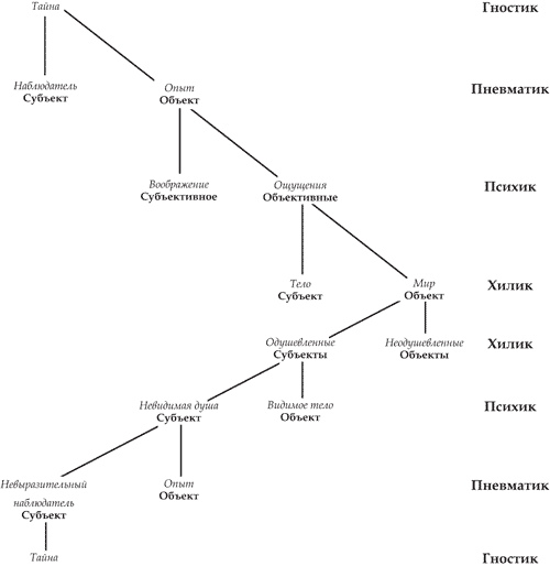 2. Тайна становится сознательной, когда частично воплощается, создавая сизигию «субъект-объект». На человеческом уровне это выражено как сизигия наблюдателя (субъекта) и опыта (объекта).