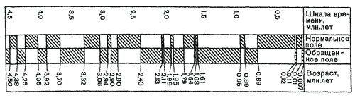 Рис. 20. Хронологическая шкала обращений магнитного поля Земли, построенная по данным радиометрических определений возраста пород, для которых измерялось направление намагниченности.