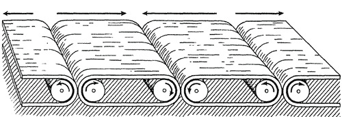 Рис. 24. Серия из четырех конвейеров, движущихся во взаимно противоположных направлениях. Сравните рис. 23.
