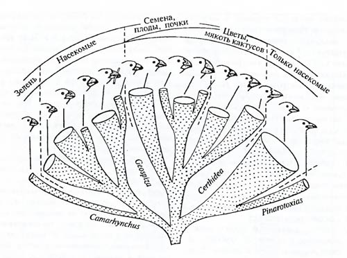 Детальный анализ островной фауны позволяет восстановить пути эволюции группы близких видов. Со времени Ч. Дарвина классическим примером такого рода считается эволюция галапагосских вьюрков (Fringillidae). 13 видов этих вьюрков обитают ныне на Галапагосах и острове Кокос (в нескольких сотнях километров). Возраст Галапагосских островов – не более нескольких миллионов лет. Какой-то предок современных галапагосских вьюрков попал сюда, вероятно, задолго до других воробьиных птиц и обитал в изоляции от континентальных видов. Этот предковый вид освоил практически все адаптивные зоны (рис. 6.12). Один из предковых видов галапагосских вьюрков попал на остров Кокос, не образовав новых форм, поскольку, несмотря на разнообразие местообитаний, отдельные части видового населения не изолированы и могут широко скрещиваться.