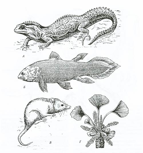 Рис. 6.13. Примеры реликтовых форм: А – гаттерия (Sphenodon punctatus); Б – латимерия (Latimeria chalumnae); В – опоссум (Didelphis marsupialis); Г – гинкго (Ginkgo biloba) (из И.И. Шмальгаузена, 1969; А. Ромера. 1969; Л.А. Курсанова и др., 1951)